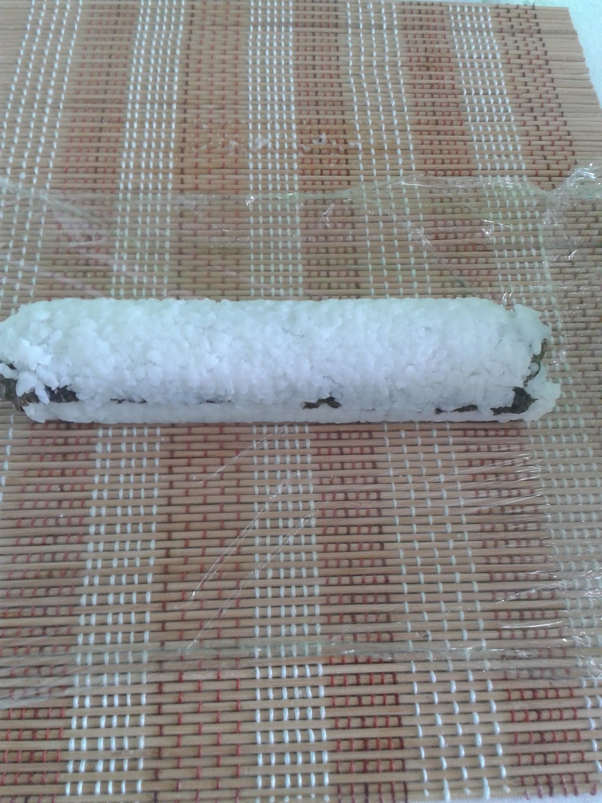 Cubra uma pequena esteira de palitinhos com filme plástico, coloque sua folha de Nori sobre ela. Coloque uma porção do arroz e vá pressionando até que ele cubra as bordas. Não precisa preencher o completamente. Siga o exemplo da foto abaixo.
